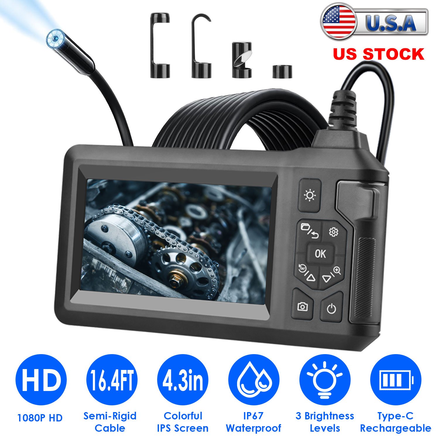 Our endoscope camera features a 4.3” colorful IPS screen, providing high-definition 1920x1080P images with a 70° viewing angle. 180° flip and image magnification function are for clear pictures in any conditions, and requires no connection, app or driver to use. 5M/16.4FT semi-rigid metal hardwire allows flexible bending at any angle to access hard-to-reach areas, while the IP67 waterproof camera works well in high-temperature and wet environments from 14°F to 113°F. Equipped with 8 premium LED beads, it ensures vivid images even in low-light conditions. Built-in rechargeable battery provides up to 3hrs of continuous work after fully charged and offers comprehensive protection against overcharging, over-current, and overvoltage.